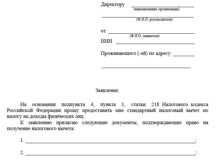 An application for a standard tax deduction must be submitted exclusively in writing. It is desirable that it be written by hand. You can print a document on a printer, but it’s better not to.